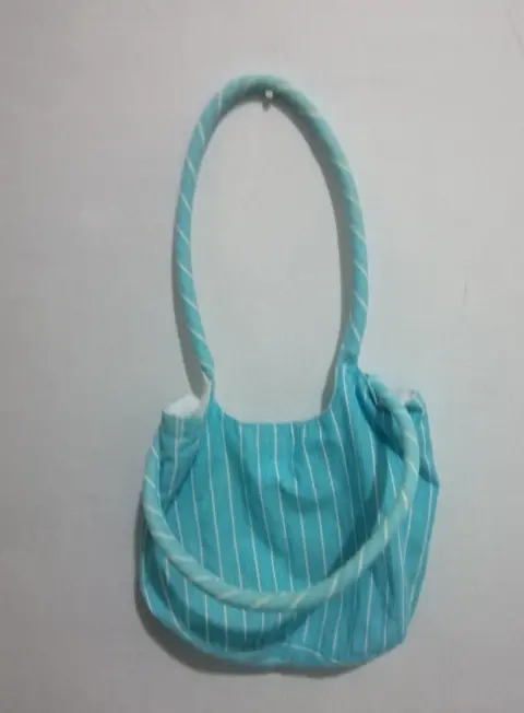 Color Azul Claro a rayas, con tirantes, cierre en la parte de atras y viene acompañado de un bolso denla misma tela