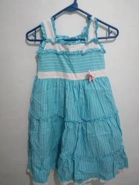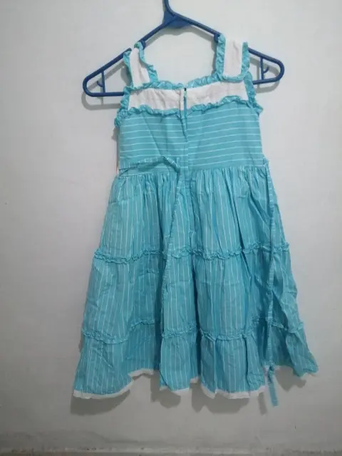 Vestido de Niña. Color Azul Claro a rayas, con tirantes, cierre en la parte de atras y viene acompañado de un bolso denla misma tela