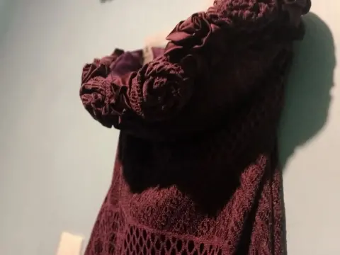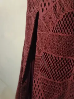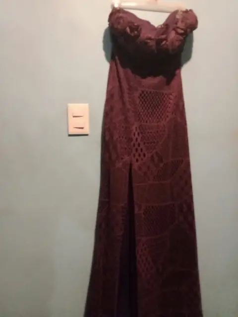 Hermoso vestido de noche, largo. En color plum. Es strapless con flores al frente. Tiene abertura en la falda. Es talla Grande