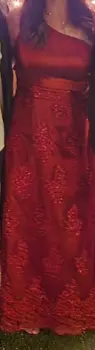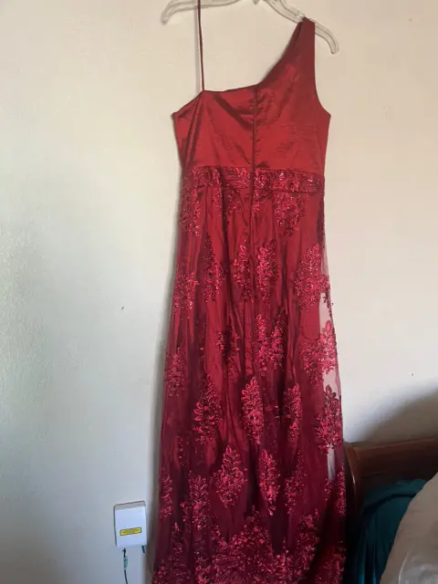 VESTIDO DE NOCHE COLOR CHEDRON, LARGO, CON FORRO Y ENCAJE BORDADO, UN SOLO HOMBRO, TALLA 12,