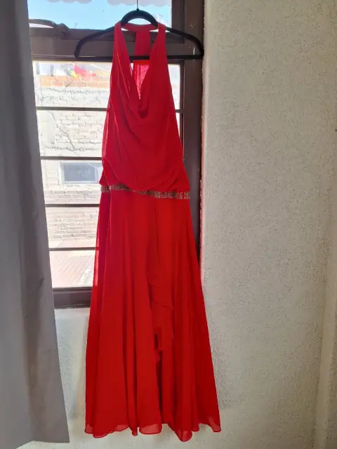 Vestido rojo con abertura en la pierna y espalda descubierta con tira en medio, talla 8 Marca Eva BRazzi, una sola puesta.