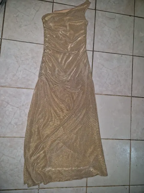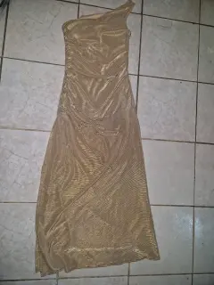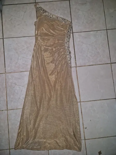 VESTIDO DE NOCHE. Vestido largo de noche dorado, con aplicaciones de piedras color plata, strech que se amolda a tu cuerpo
