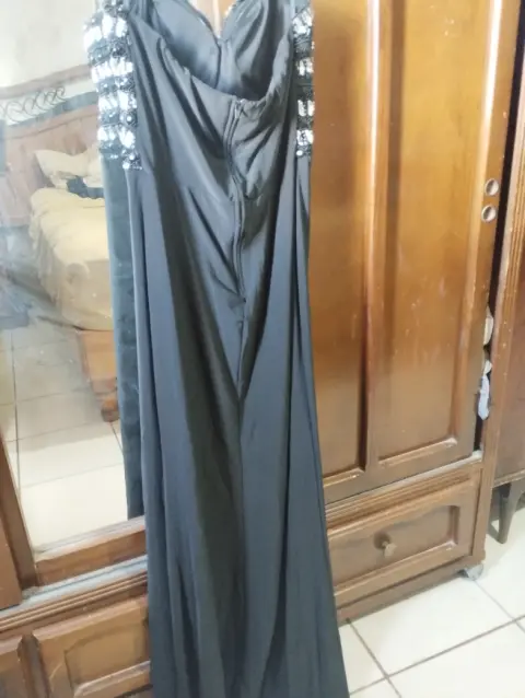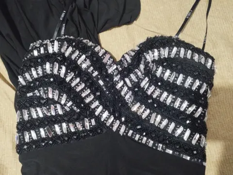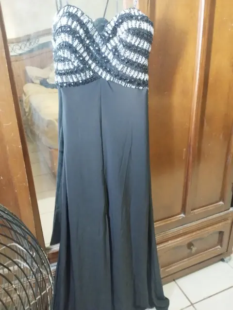 Vestido de fiesta, straple, color negro con aplicaciones en chaquira y canutillo negro, piedras transparentes, largo, con abertura a media pierna, talla 7/8, marca, B. Darling. La tela es licra, sin vuelo.