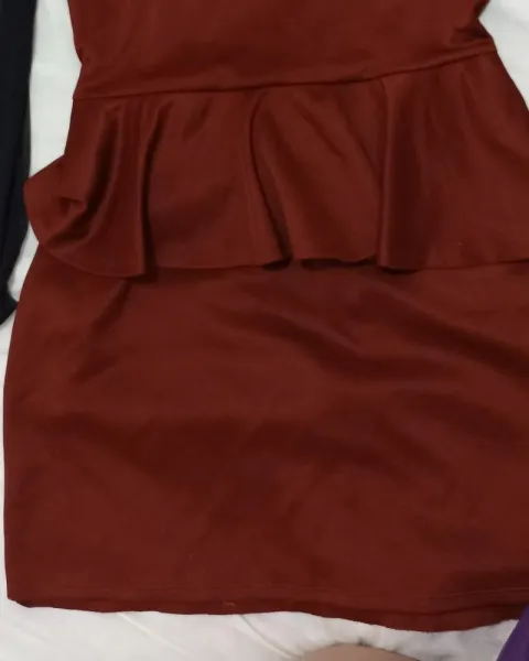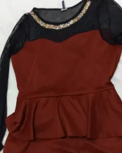 Vestido de noche manga larga talla G-XL, colo rojo con tela transparente negra en la parte superior y detalles de piedritas en el cuello. Ningun uso