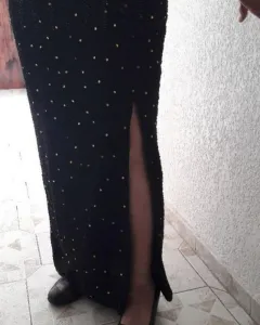 Vestido largo con abertura en pierna izquierda , hecho con telas de la India, transparencia en brazos, composición de chaquira y lentejuelaTalla reducida a L aproximadamente Medidas: Talla 14