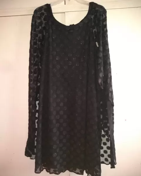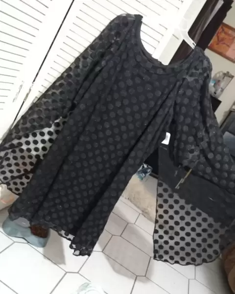 Vestido negro con detalle de brillo en tela mangas tipo capa