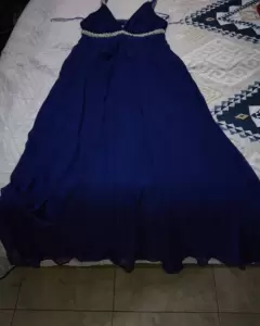 Vestido de noche, largo corte princesa, media espalda descubierta. Color azul marino, perlas en los tirantes y escote.