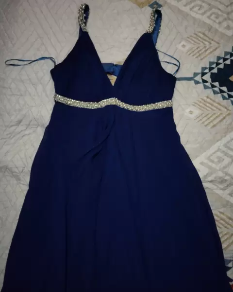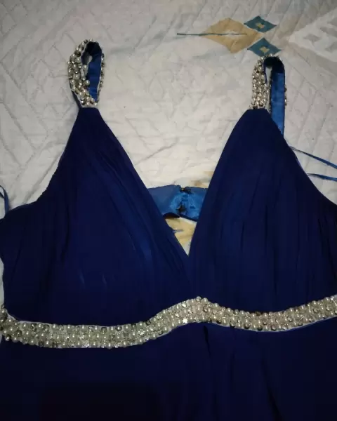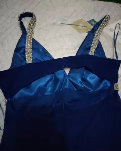 Vestido de noche. Vestido de noche, largo corte princesa, media espalda descubierta. Color azul marino, perlas en los tirantes y escote.