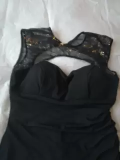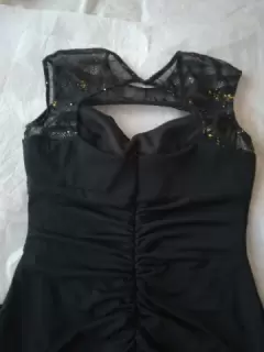 Vestido de noche con toque de lentejuelas doradas y olán izquierdo acinturado talla chica la tela estira y ajusta