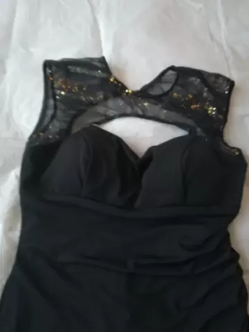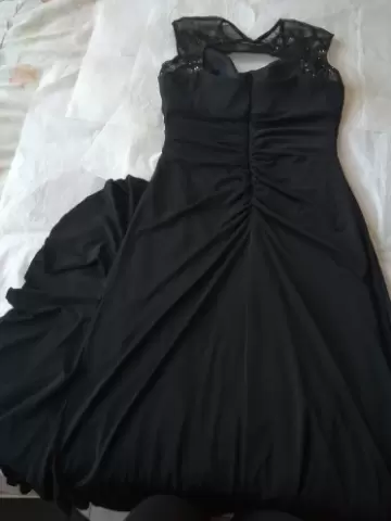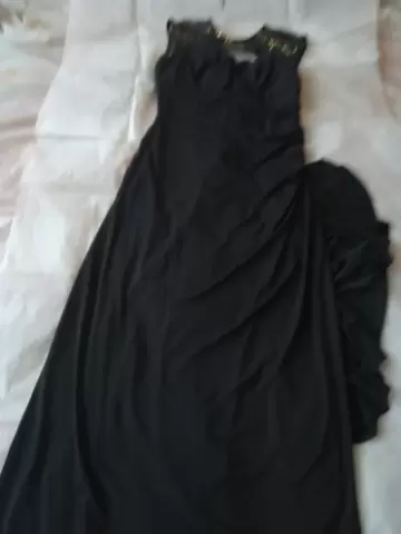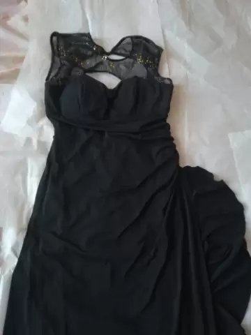 Vestido de noche. Vestido de noche con toque de lentejuelas doradas y olán izquierdo acinturado talla chica la tela estira y ajusta