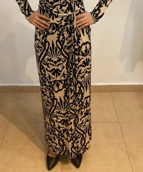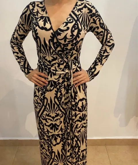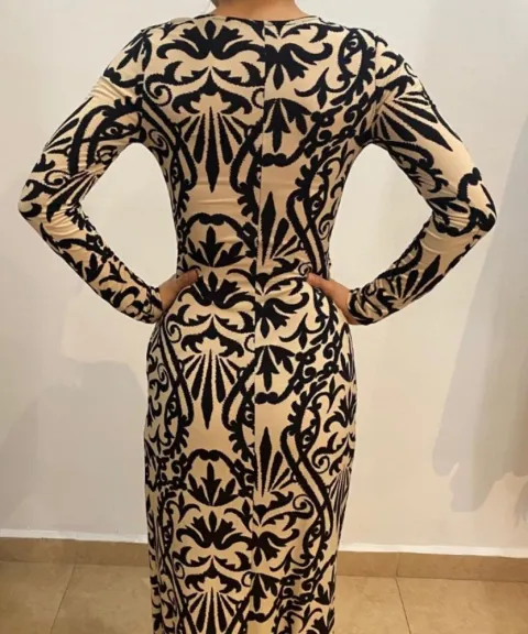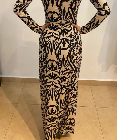 Vestido largo de noche, manga larga tela que estira no se transparenta, queda hermoso y se ajusta al cuerpo estalla unica puede quedarle a talla S/M, sin detalles de dañado.
