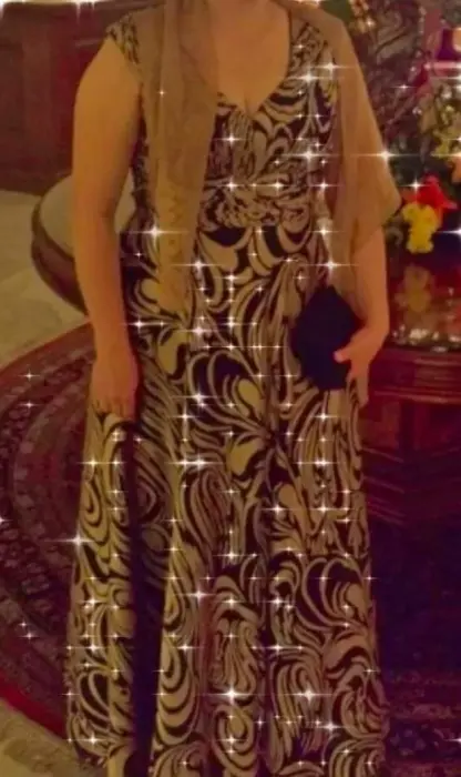 Vestido de noche, puesto una sola vez, dorado con negro, largo, el talle con resorte en la espalda