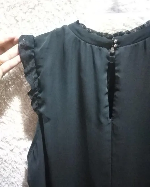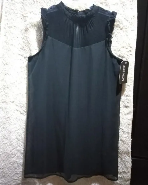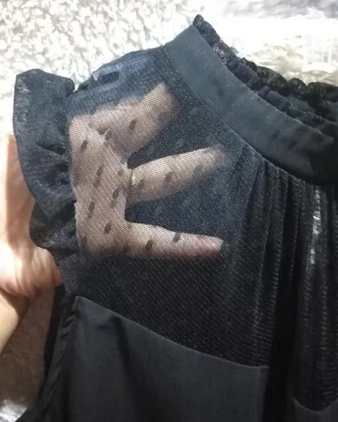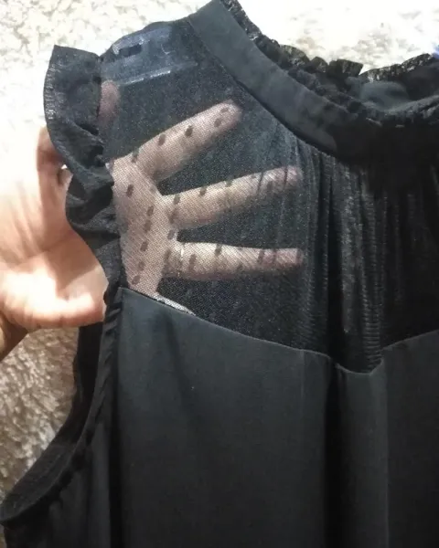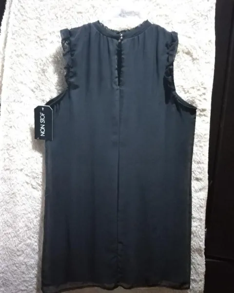Vestido negro sin mangas ideal para una reunión en un jardín o bien de noche. Escote con transparencia en la parte de enfrente y corte circular