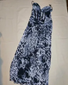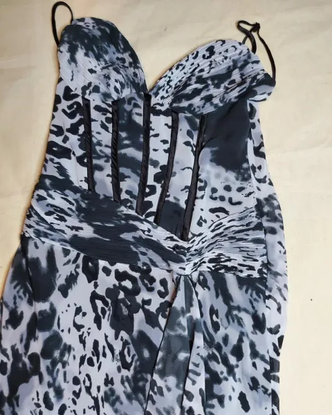 Vestido de noche animal print. Padrísimo vestido animal print negro con gris tipo corset del tronco, tirantes y espalda descubierta, se pone un cordón cruzado en la parte de la espalda, en la parte de enfrente esta abierto y forma un olán muy lindo , se ve waw puesto!😍 No tiene talla suegra a S y M.