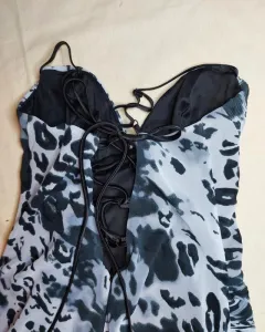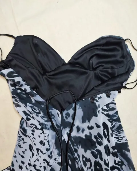 Padrísimo vestido animal print negro con gris tipo corset del tronco, tirantes y espalda descubierta, se pone un cordón cruzado en la parte de la espalda, en la parte de enfrente esta abierto y forma un olán muy lindo , se ve waw puesto!😍 No tiene talla suegra a S y M.