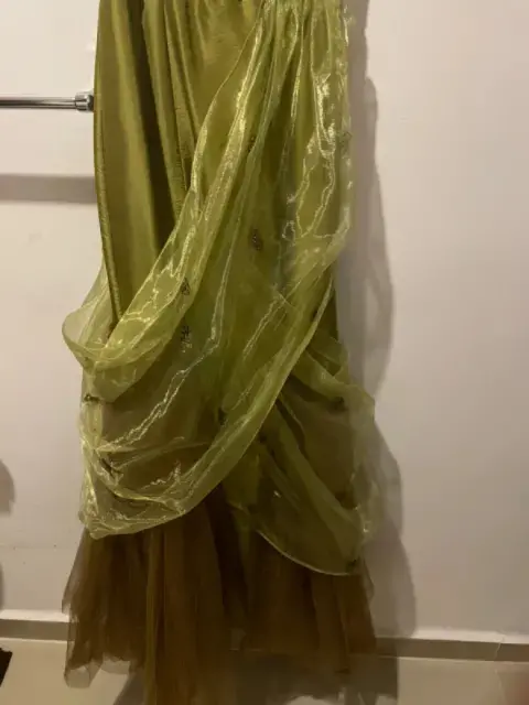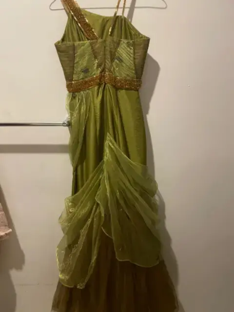 vestido de Noche color verde olivo. Vestido de noche color verde olivo con aplicaciones en color dorado, talla XS. Ideal para un evento súper elegante. De la diseñadora yucateca Vero Díaz