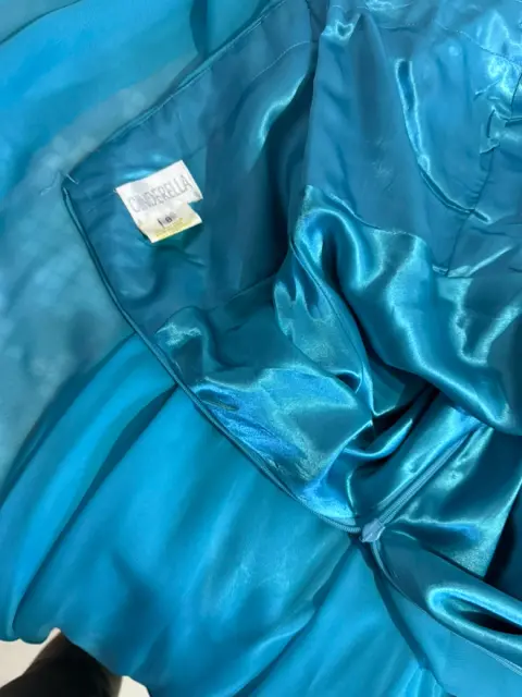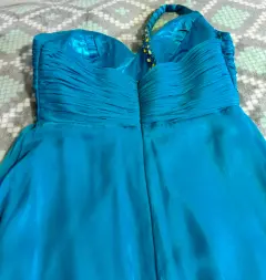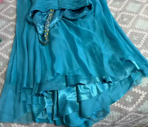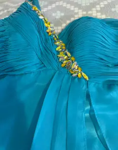 Vestido de noche con piedras. Vestido largo, color verde menta, de un solo hombro, con pedrería, es muy largo, yo miro 1.65 y si me quedó arrastrando tantito, por eso muestro las orillas de cómo lo ajuste