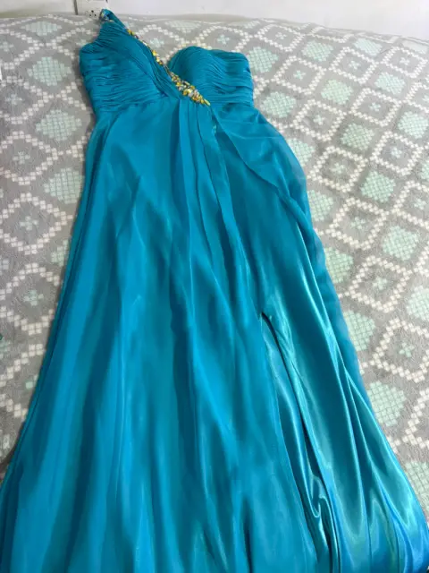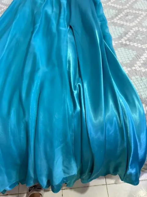 Vestido largo, color verde menta, de un solo hombro, con pedrería, es muy largo, yo miro 1.65 y si me quedó arrastrando tantito, por eso muestro las orillas de cómo lo ajuste