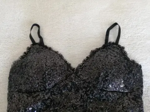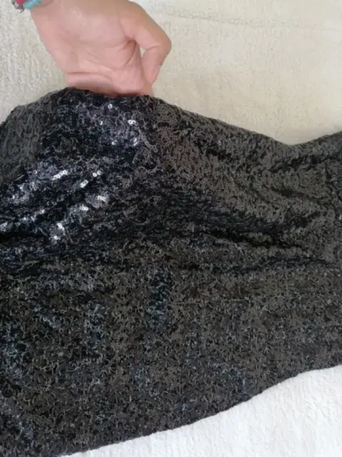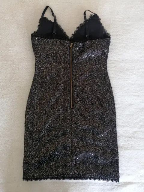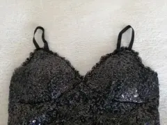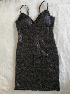 Vestido Corto, tela brillante y elástica con tejido de lentejuela, tirantes ajustables, forro elástico, copas, cierre a media espalda, pequeño encaje en final de vestido y escote, horma padrísimo