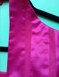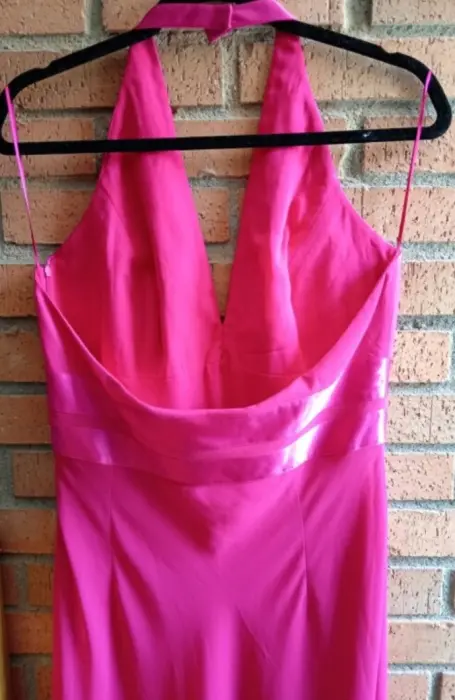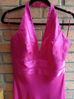 Hermoso vestido fucsia, escote en V y espalda descubierta, acinturado, la tela no estira