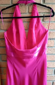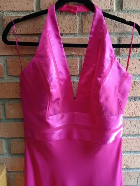 Vestido de noche, escote en V. Hermoso vestido fucsia, escote en V y espalda descubierta, acinturado, la tela no estira