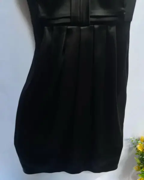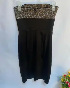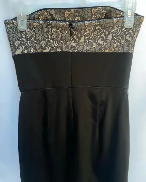 Vestido de noche esstraple satín dorado. Vestido de noche esstraple satín dorado y encaje, corte imperio de bajo el busto un moño parte de adelante con 6 tablones el centro del vestido da una ligera expansión y soltura en la tela. Las copas cuentan con un corte princesa. En espalda cierre invisible y broche de seguridad, corte a la cintura junto con pinzas de centro.Talla: XS (22-24) Puede quedar a una talla 26.Marca: WAITE BLACK.
