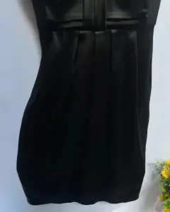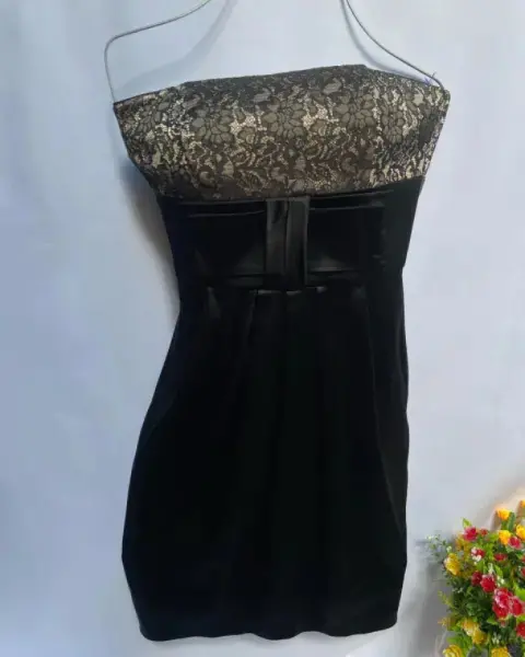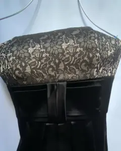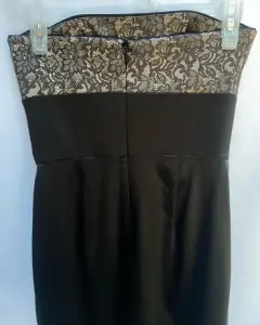 Vestido de noche esstraple satín dorado y encaje, corte imperio de bajo el busto un moño parte de adelante con 6 tablones el centro del vestido da una ligera expansión y soltura en la tela. Las copas cuentan con un corte princesa. En espalda cierre invisible y broche de seguridad, corte a la cintura junto con pinzas de centro.Talla: XS (22-24) Puede quedar a una talla 26.Marca: WAITE BLACK.