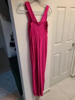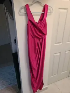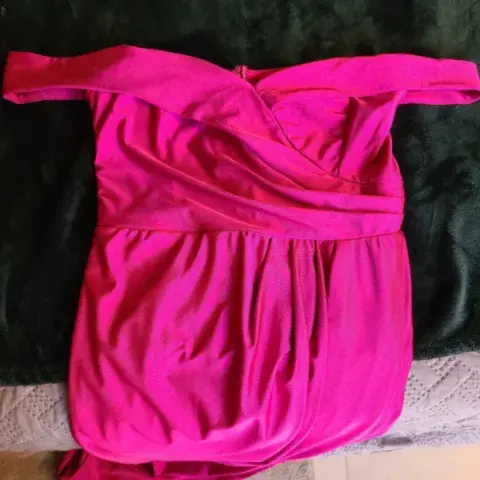 Vestido de noche Rosa Barbie. Vestido para fiesta, tela stretch, solo lo usé 1 vez para un evento, es talla M pero como a mi me quedó poco grande del busto tiene unas pinzas (las puedes deshacer) puede quedar a talla SQueda pegado al cuerpo con abertura en pierna, y las mangas van caídas a los hombros