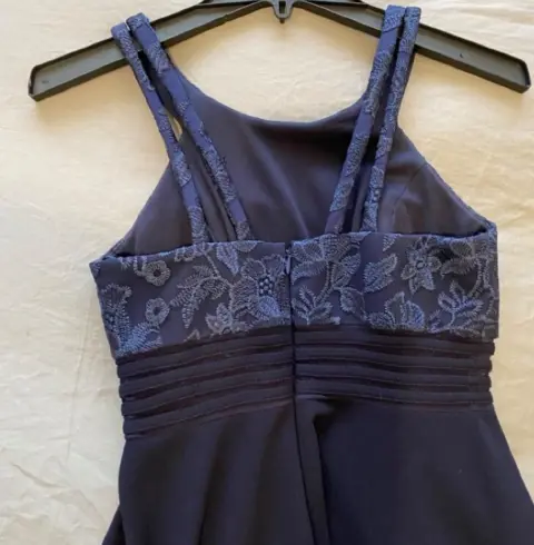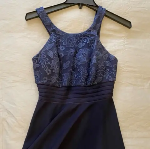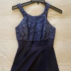 Vestido de fiesta talla 5 en color azul de noche , cuello redondo , aplicación de encaje perfectas condiciones