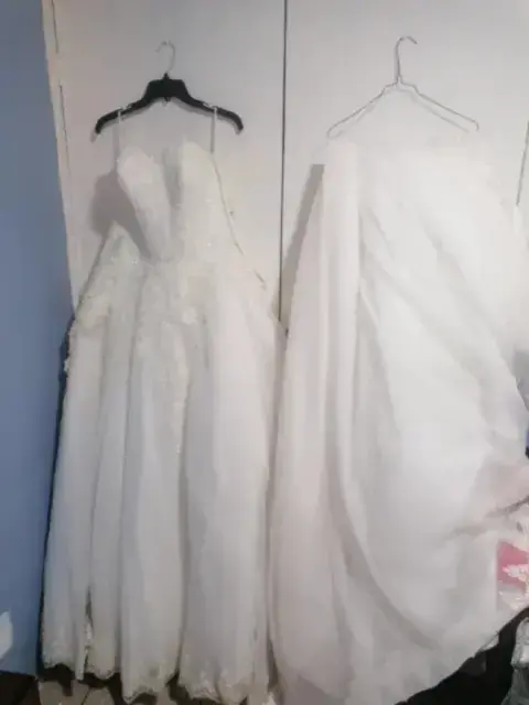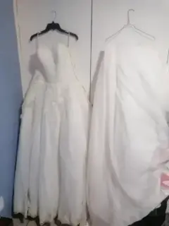 Vendo mi vestido de novia, color ivory con doble brillo, no es tull. cauda desmontable. Incluye un ramo y un lazo Tiene su aro para hacer volumen corte princesa