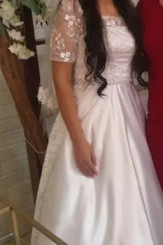 Vestido de novia blanco, tela satin en la parte de abajo, y bordado a mano en la parte de arriba, con bolsitas a los lados, y manga 3/4, incluye crinolina, y encaje en toda la cola, con opción de subirse y dar vista de abanico