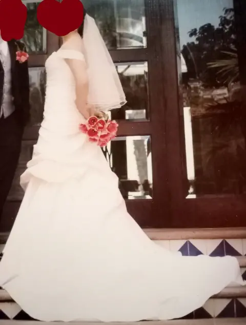 Es un vestido de novia, color Ivory, en excelentes condiciones, limpio, talla 12, ajustable, tiene crinolina y cola, tiene mangas que se desmontan para ser strapless.