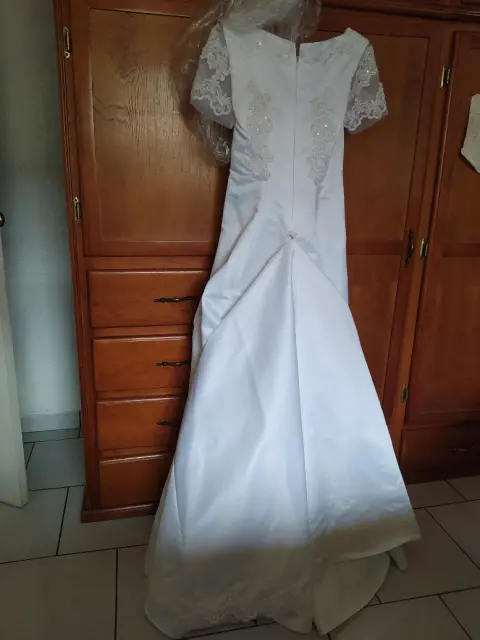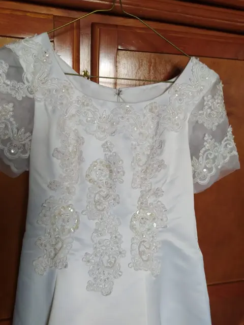 Vestido de novia. Línea A, con cola que se abotona atrás, crinolina. Talla chica. En excelentes condiciones