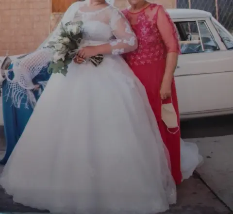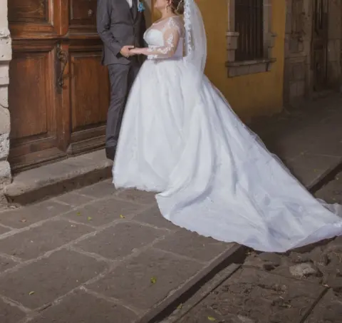 Vestido de novia color blanco, cómodo de corte princesa con transparencia. Talla L- XL se ajusta porque es de corset
