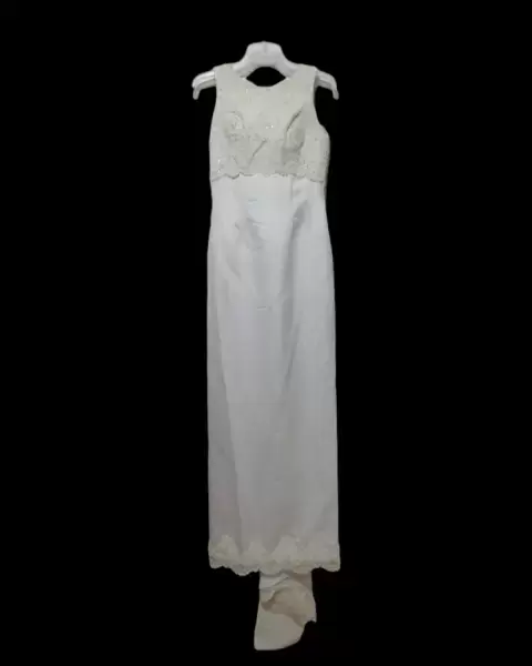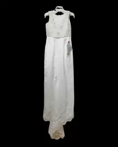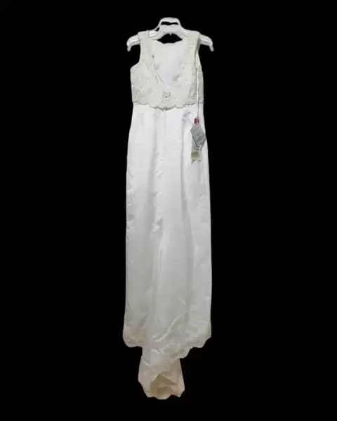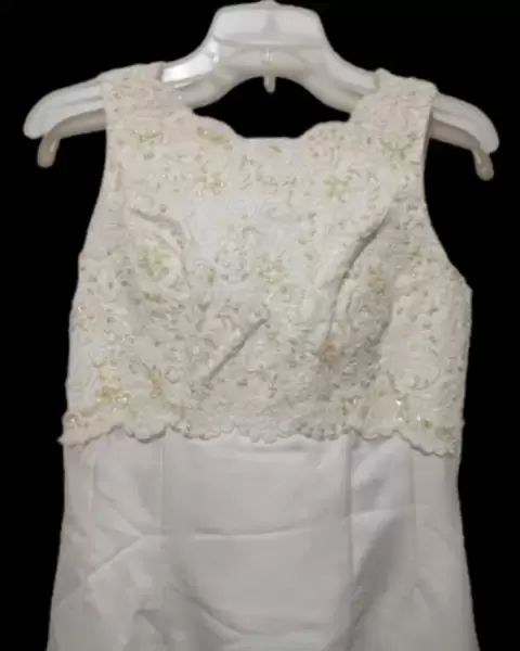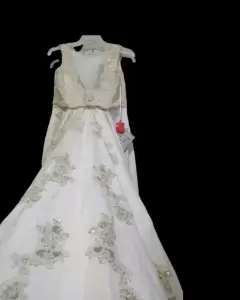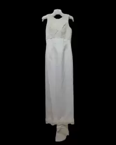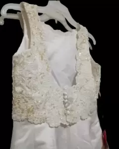 Hermoso vestido de novia talla 8, ideal persona con espalda angosta así que va a ch, con hermoso escote en espalda, cola larga desmontable, es de diseñador recomiendo tintorería por que ha estado guardado, NO TIENE DETALLES..