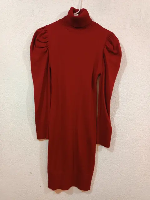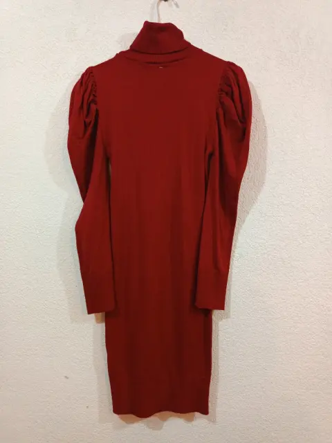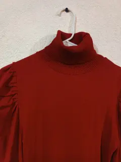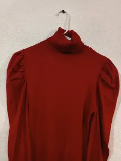 Vestido de Punto calientito, manga de globo y cuello de tortuga, color rojo quemado.