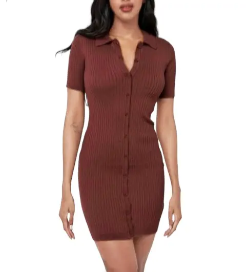 Hermoso vestido en tela de punto con cuello tipo polo en color cocoa 🤎 Súper fresco, bonito, favorecedor y combinable 🤎 Tiene botonadura completa. Está increíble de verdad hace super linda figura 🤎El color real es más parecido al de la foto número 6Talla M ✨