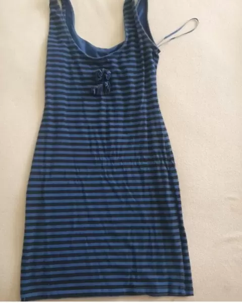 Vestido ajustado de rayas, estira muy poco, sin mangas , viene muy corto es poco elastico . Atras tiene 2 moñitos como detalle. La talla dice M pero viene reducido como.SMedidas:Axila a axila: 32 cmCintura: 29 cmLargo desde el cuello : 49 cm