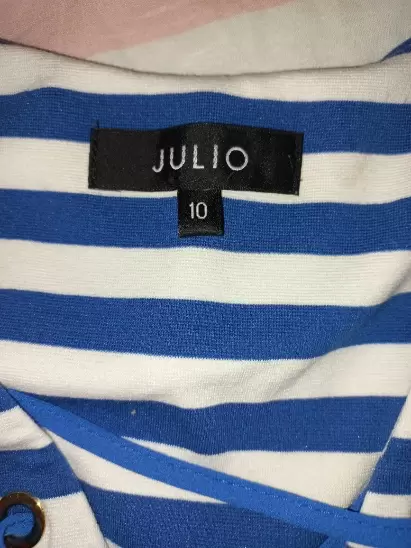 Vestido de rayas casual. Hermoso vestido corto con manga 3/4, doble color azul rey y blanco con detalles en dorado que lo hacen lucir elegante. Las medidas las encuentras en las fotos. Tiene ligero detalle de uso en la manga pero no se ve puesto. Es de una tela un poco stretch. Talla 10. Sin detalles.
