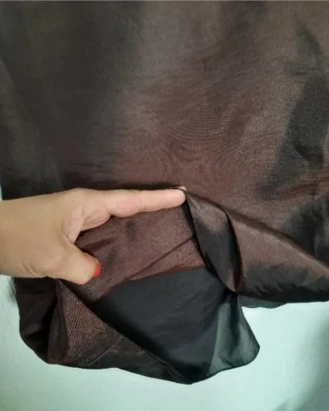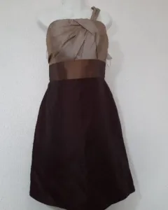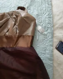Talla 10 tela shantug enntonos dorados y cobre y café 44 cm de axila a axila y 76 cm de circunferencia de cintura con tirante en un hombro