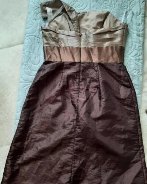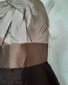 Vestido de shantug tonos tierra. Talla 10 tela shantug enntonos dorados y cobre y café 44 cm de axila a axila y 76 cm de circunferencia de cintura con tirante en un hombro