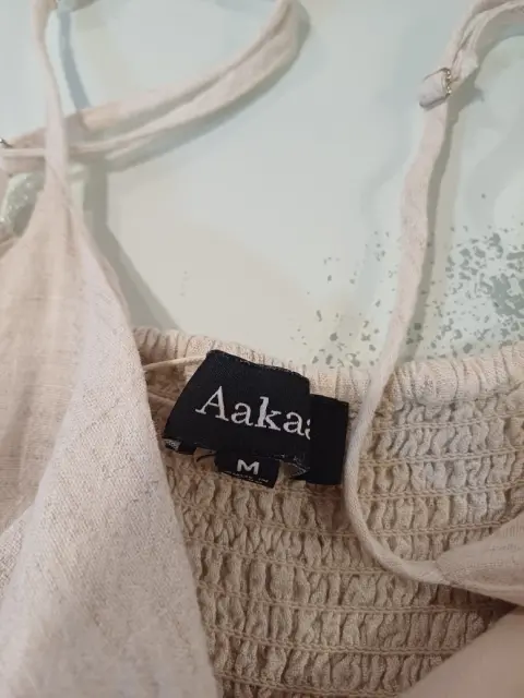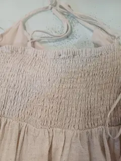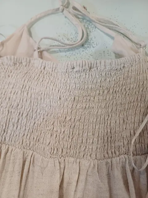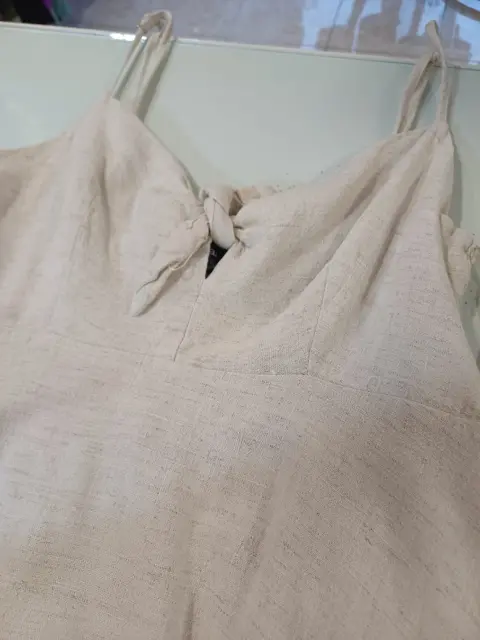 Hermoso vestido color beige de tirantes ajustables. Tiene una hermosa caída. La tela es lino y rayón. Tiene un nudo en escote y la parte de la espalda es como resorte, por lo que ajusta al cuerpo y estira.Las medidas son ax a ax 40 CM, cintura 35 CM, largo 94 CM.