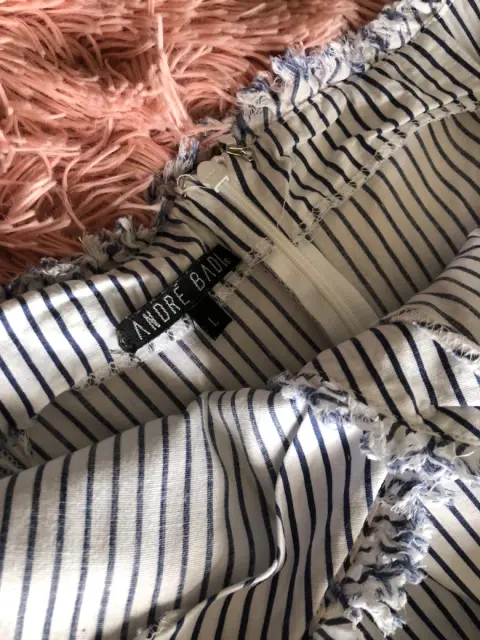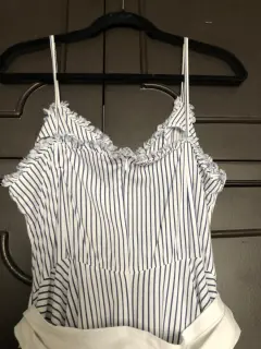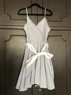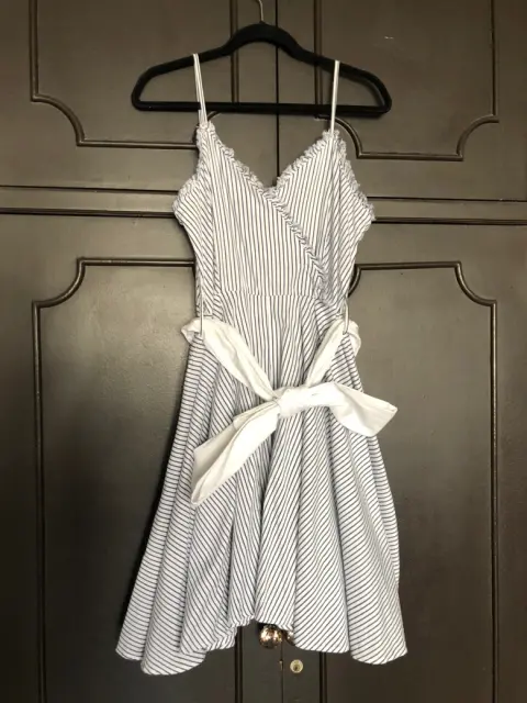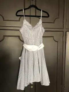 Hermoso vestido en corte línea A, con mucho vuelo, cuenta con cinto y moño versátil al frente, tirantes y cruzado al frente, tela 100% algodón, fondo blanco y rayas en azul marino y cierre en espalda. Medidas Cintura 40cm, de axila a axila 47cm, largo desde tirante 93cm, no tiene ningún detalle solo se usó una vez.