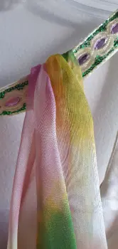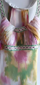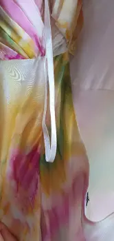 Cuenta con piedras bordadas, con shaquira y canutillo. De Tul con flores en talla 10 americana.40 cm de cinturaDe cintura hacia abajo son 165 cm de largo