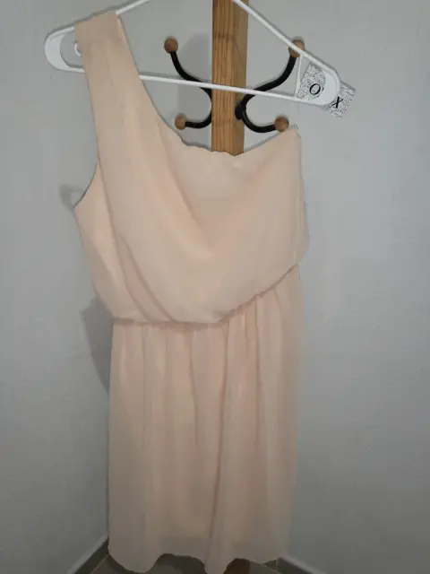 Vestido de un hombro. Hermoso Vestido corto, color crema, tela delgada con forro, botones discretos de un lado