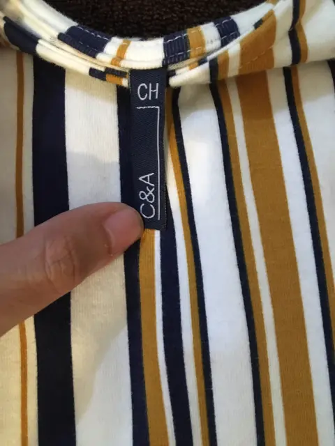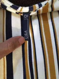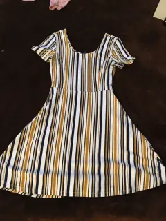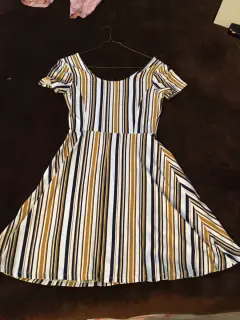 Vestido blanco con rayas amarillas y azules, con diferentes patrones. Talla Ch. Cuello U