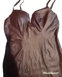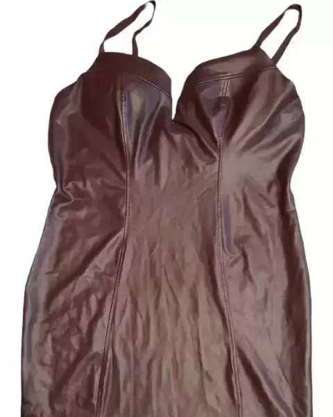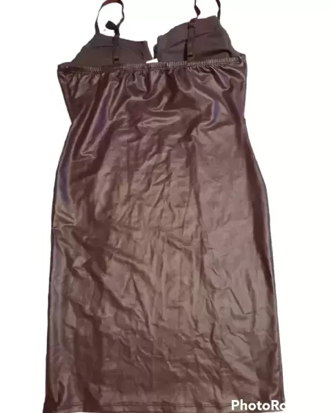 Hermoso vestido de vinipiel tipo spandex, largo tipo lapiz con escote "V" y copas en pecho. Color vino talla S.