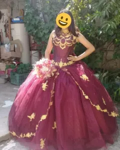 Vestido de XV años color vino con decoraciones doradas cuello halter no incluye accesorios ni crinolina