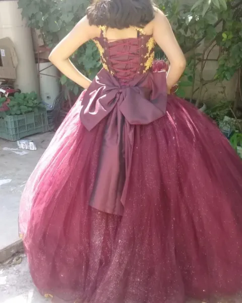 Vestido de XV. Vestido de XV años color vino con decoraciones doradas cuello halter no incluye accesorios ni crinolina