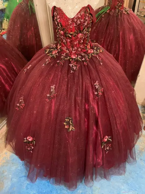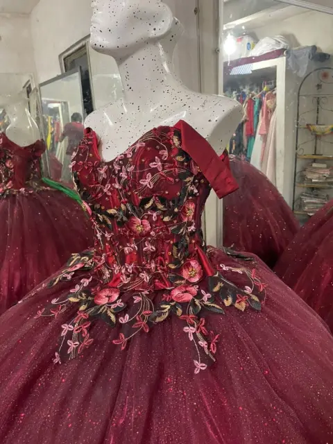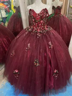 Vestido color vino con detalles tipo bordados. Un solo uso y en excelentes condiciones. Incluye:Falda y corsetCrinolinaFalda para el showTocadoRamo